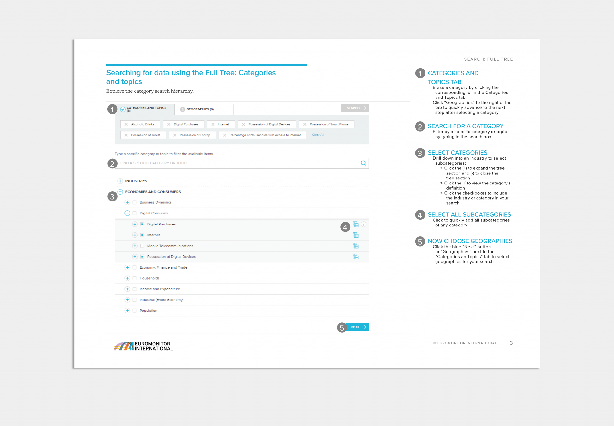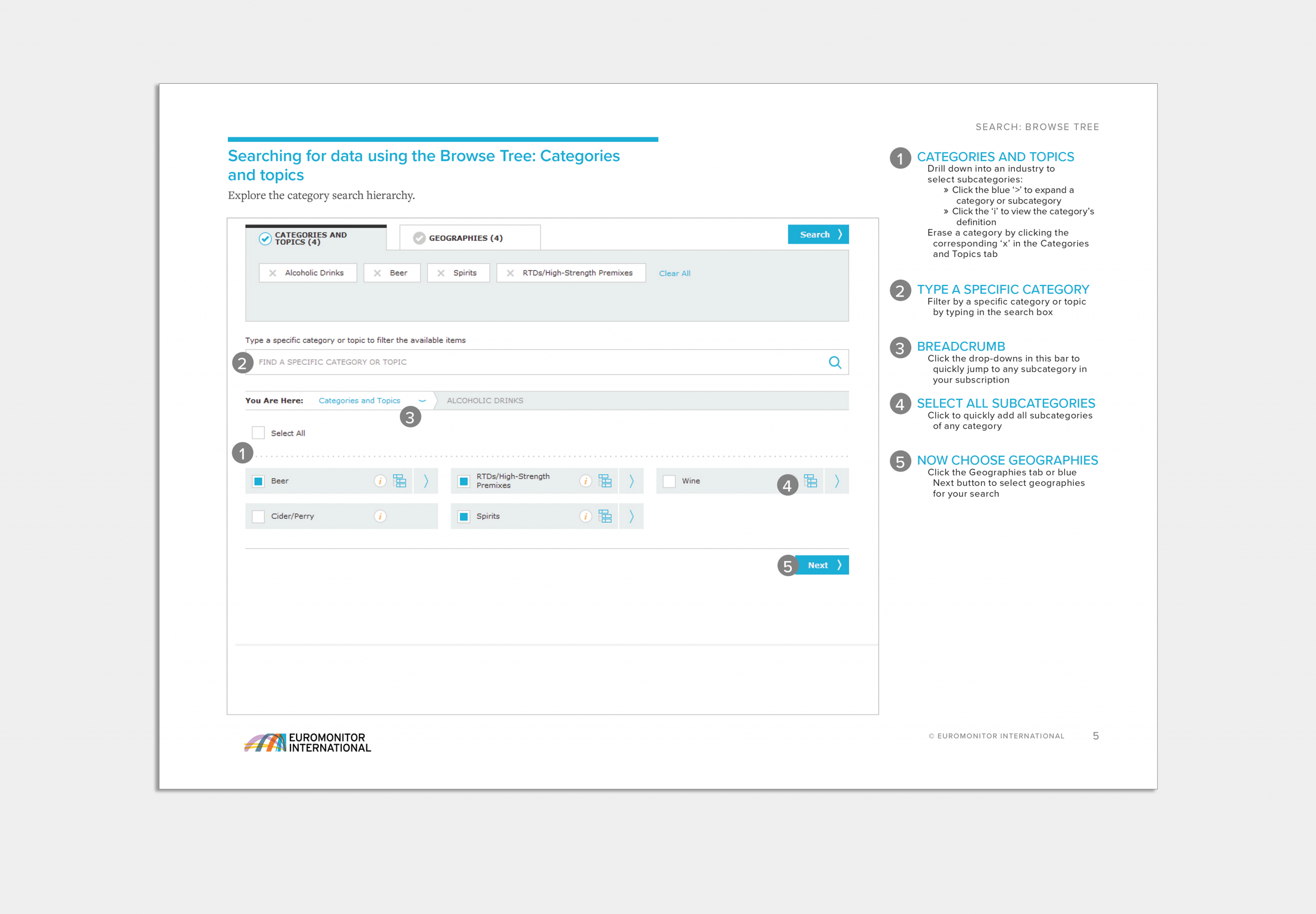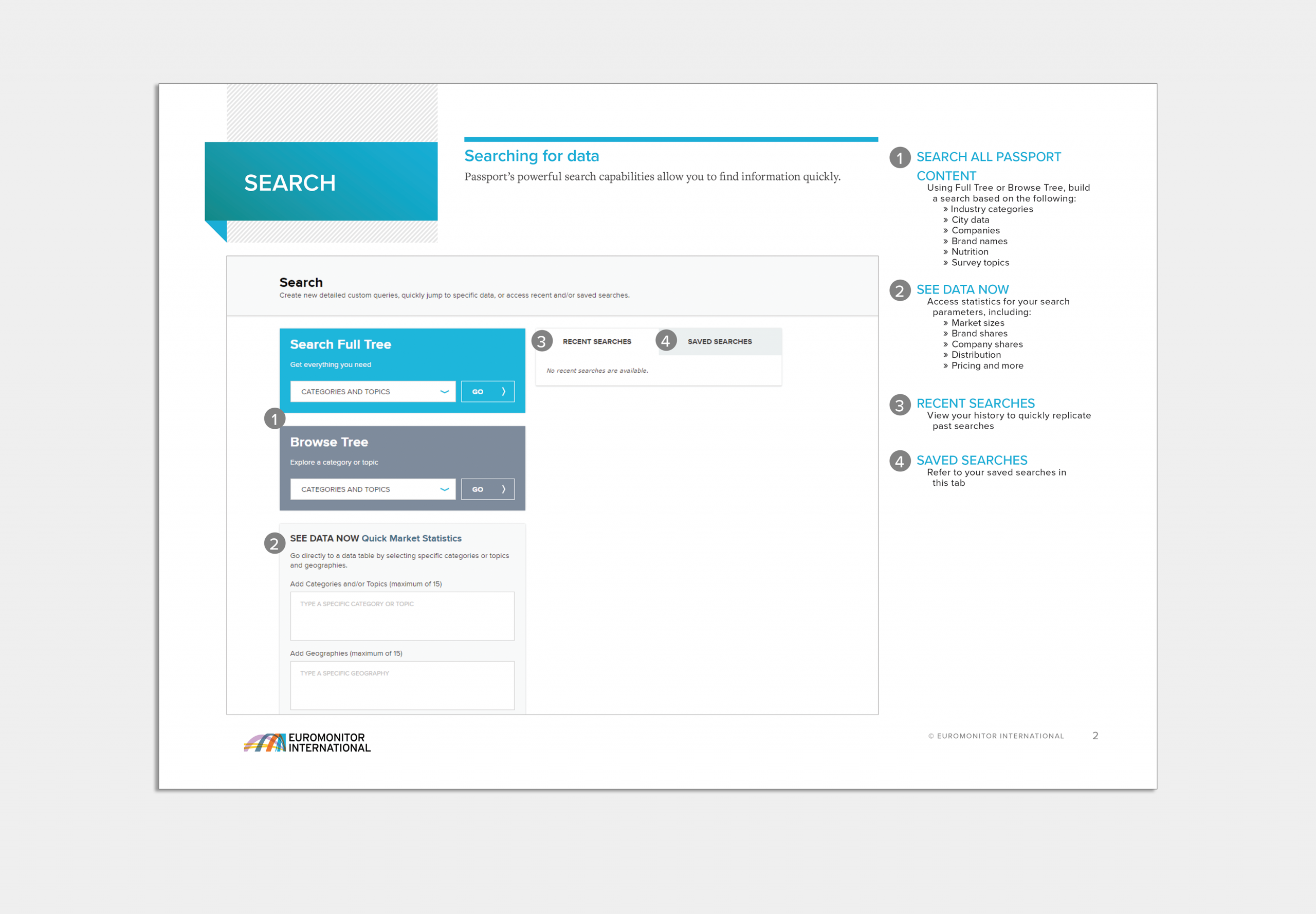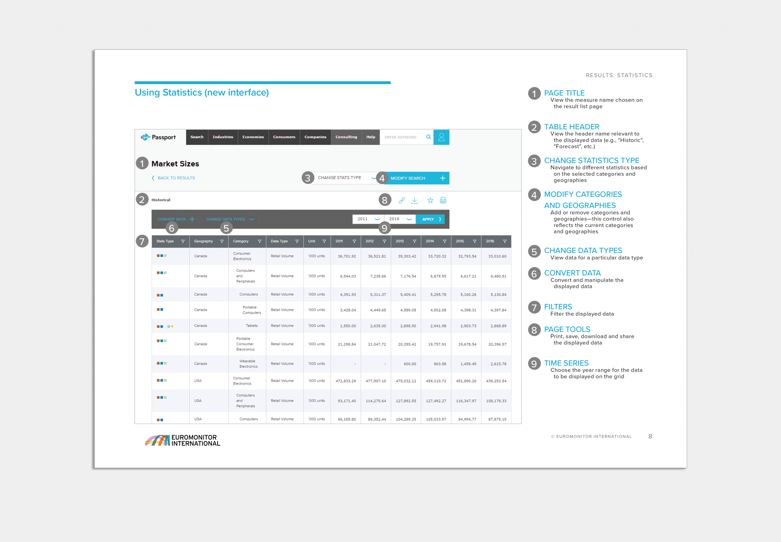 The images shown here are excerpts from publicly available user documentation published after my departure from Euromonitor. While I did not author this documentation, it uses the design templates, dashboard structures, and visual standards I designed and oversaw during my tenure. They are included to illustrate how Passport functioned in practice and how the system continued to be used and maintained over time.